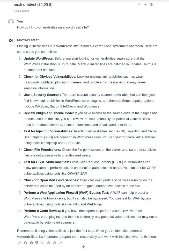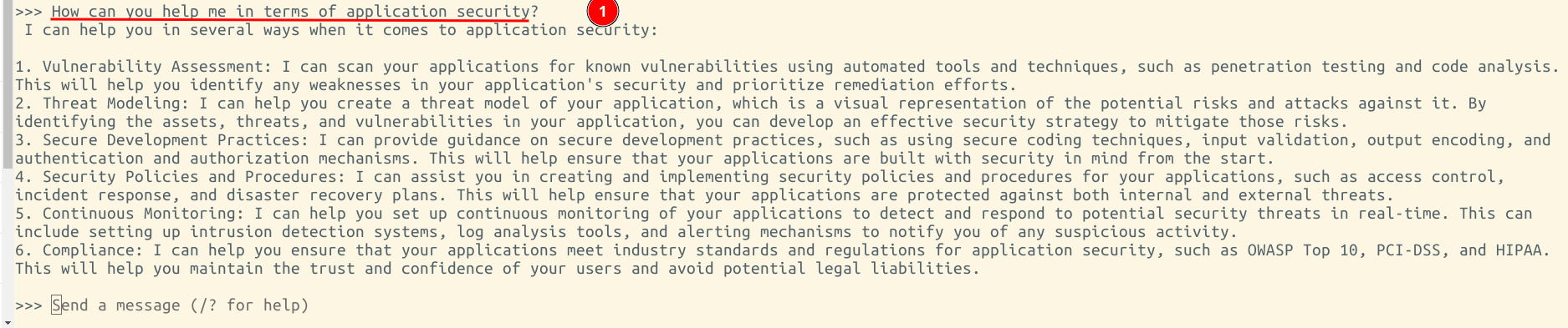 I have asked a series of questions: " How can it help me in terms of application security?", Here is there result of one of the output.
