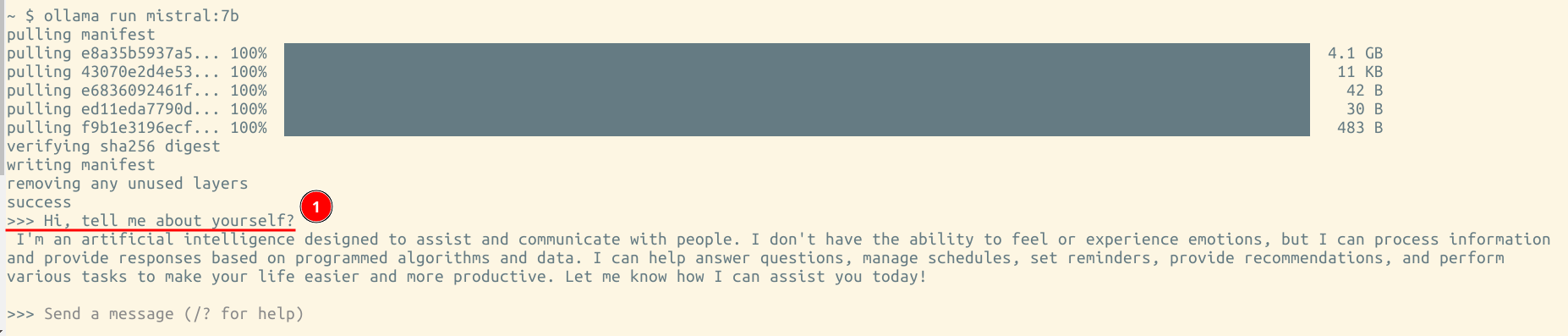 The " ollama run" command will pull the latest version of the mistral image and immediately start in a chat prompt displaying " >>> Send a message" asking the user for input, as shown below.