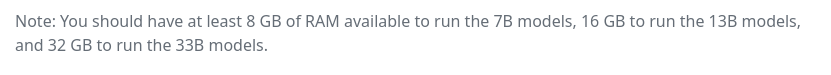 Observe that the size of the language mode is 4.1GB of a data set with 7 billion parameters. For this model, having 8 GB of RAM is fine, but better if you have 16GB of RAM.