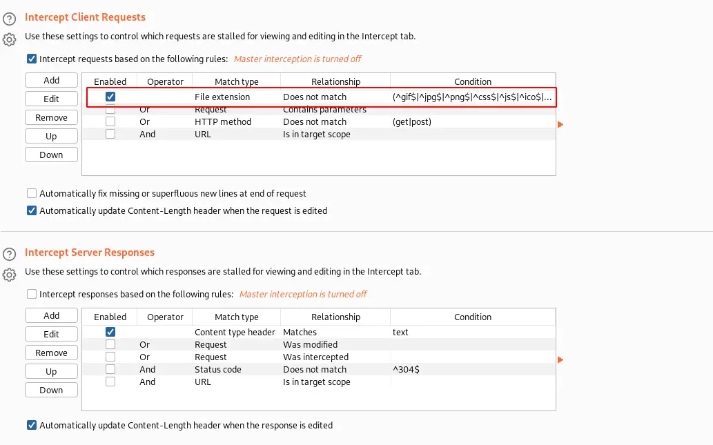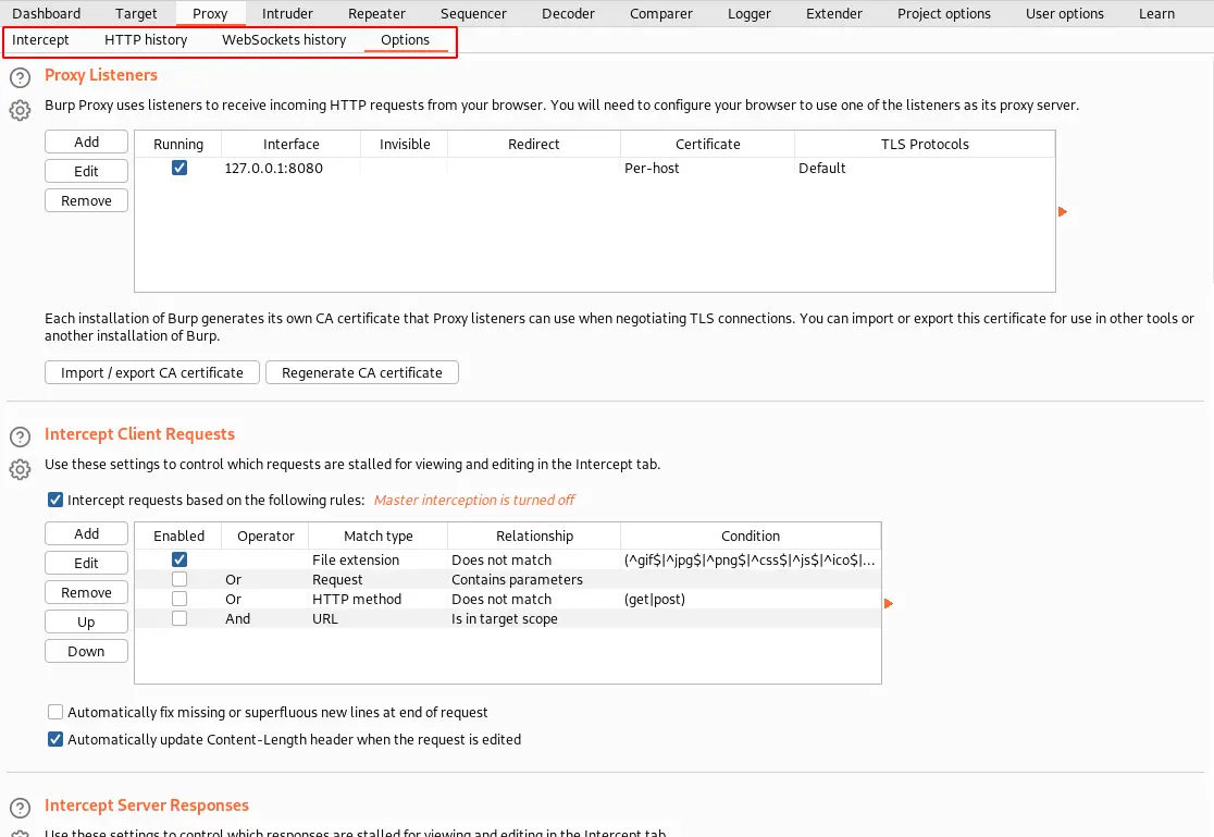 Navigate to the “Proxy” tab ⇾ “Options” ⇾ “Intercept Client Requests”. As shown in the above screenshot.