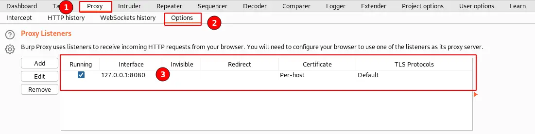 Navigate to the “Proxy” tab ⇾ “Options” ⇾ “Proxy Listeners”. As shown in the above screenshot.