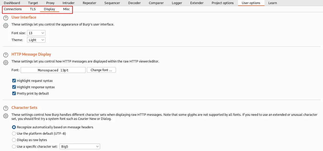 Lastly, to save all the changes, navigate to the “Burp” menu ⇾ select “User Options” ⇾ “save user options”. Using the same way, you can load the saved options using “Load user options”.