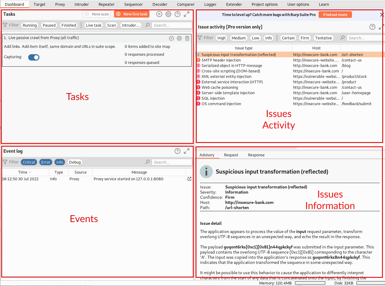 The above issues sections are only available in the BurpSuite Professional edition.