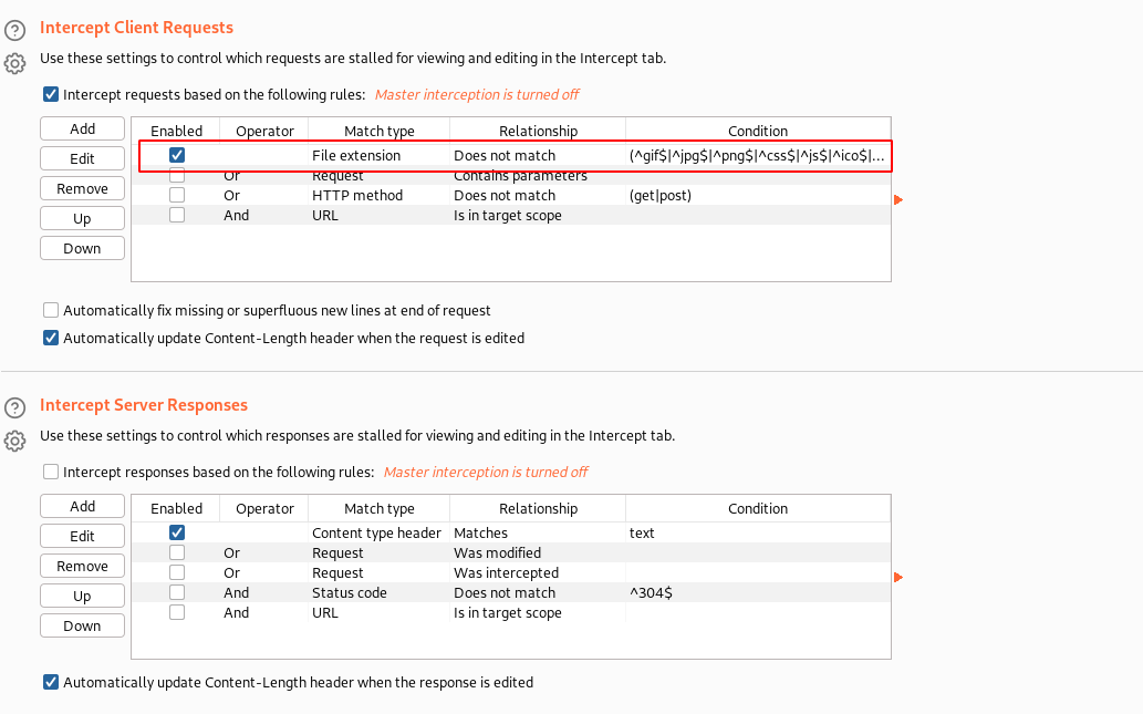 Navigate to the “Proxy” tab ⇾ “Options” ⇾ “Intercept Client Requests”. As shown in the above screenshot.
