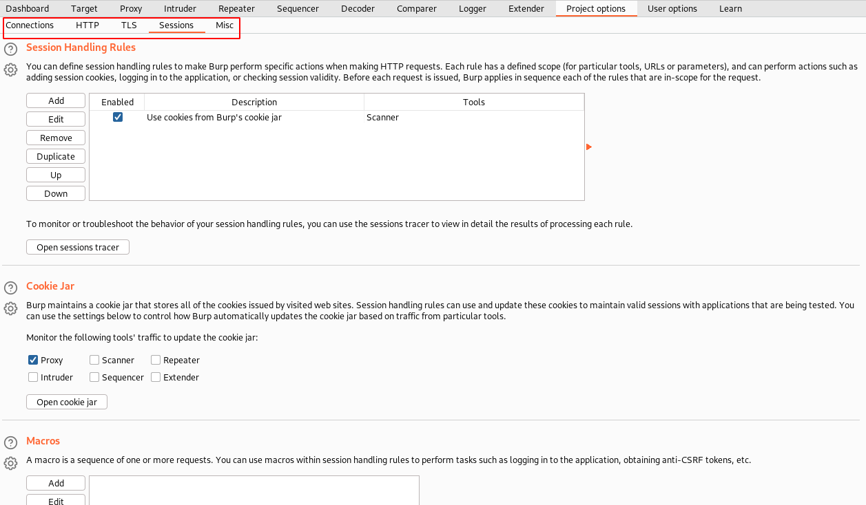 Project options provide you with a lot more benefits to tweak session handling rules, how and where the cookies are maintained, Macros to repeat a sequence of actions based on rules, HTTP communication preferences, etc.