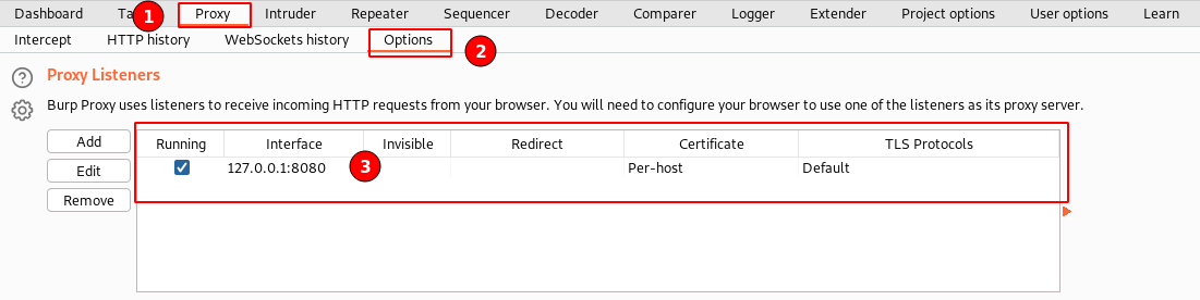 Navigate to the “Proxy” tab ⇾ “Options” ⇾ “Proxy Listeners”. As shown in the above screenshot.