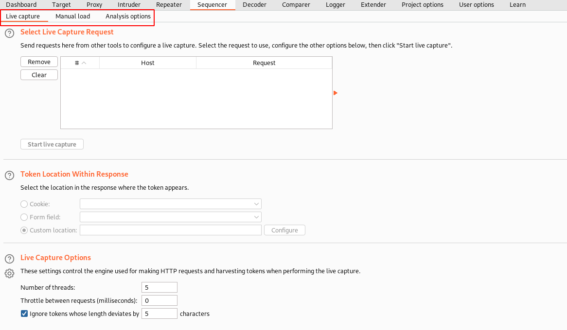 Live capture helps you to capture each request directly by interacting with the web server. Whereas Manual load is a place where you can give samples of the tokens you have collected for analyzing the strength of the tokens.