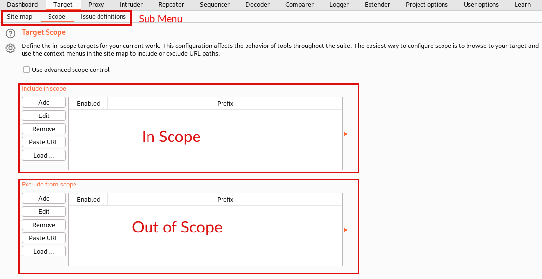 The target tab consists of three items, site map, scope, and issue definitions.