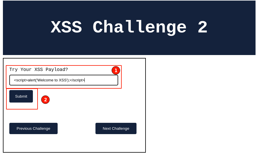Post setting up the lab, visit http://localhost:8066. The application should be loaded as shown below and Navigate to " XSS Challenge 2 ."