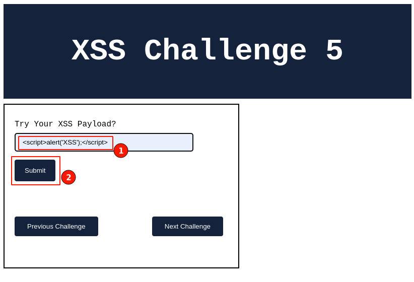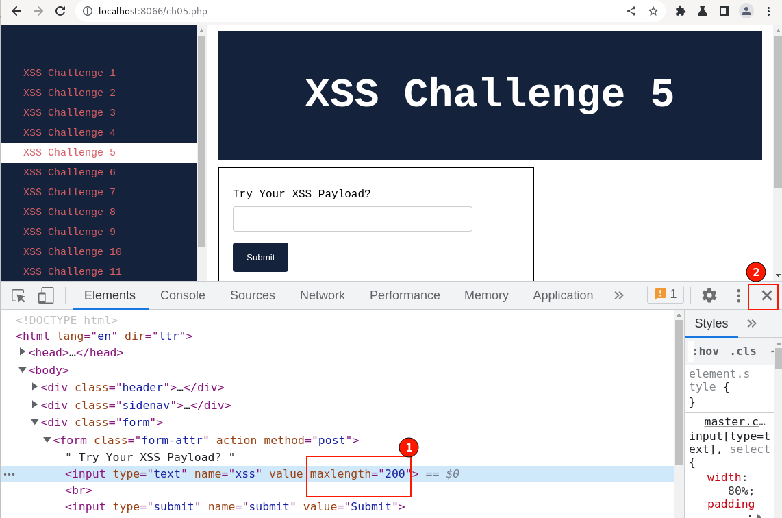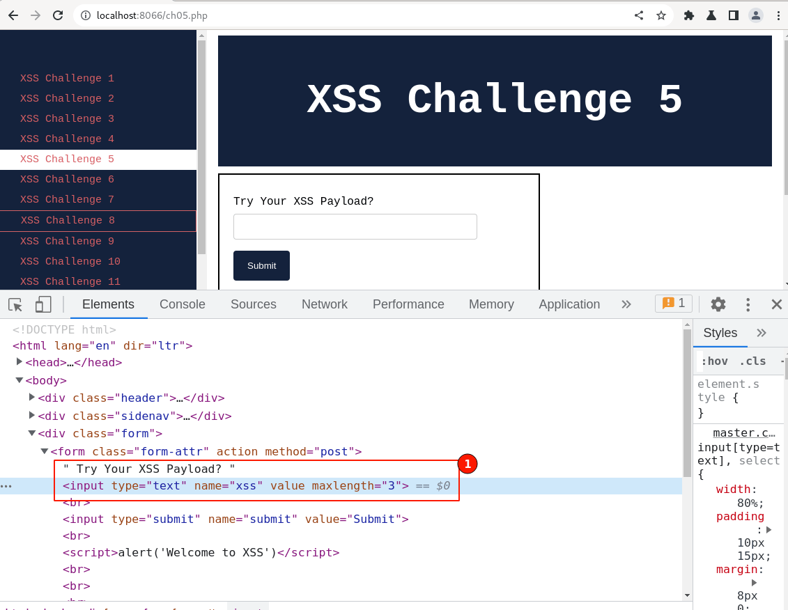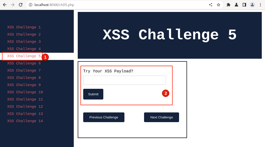 Post setting up the lab visit http://localhost:8066 and ensure it's accessible, then navigate to " XSS Challenge 5".