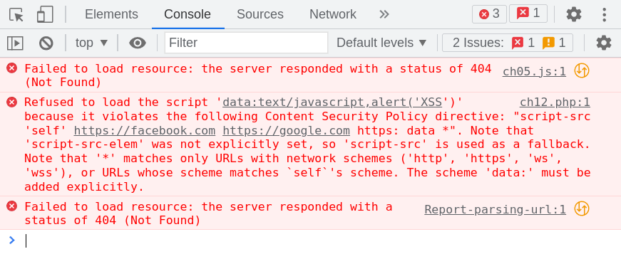 As expected, the browser blocks script code due to CSP violations and prevents execution.