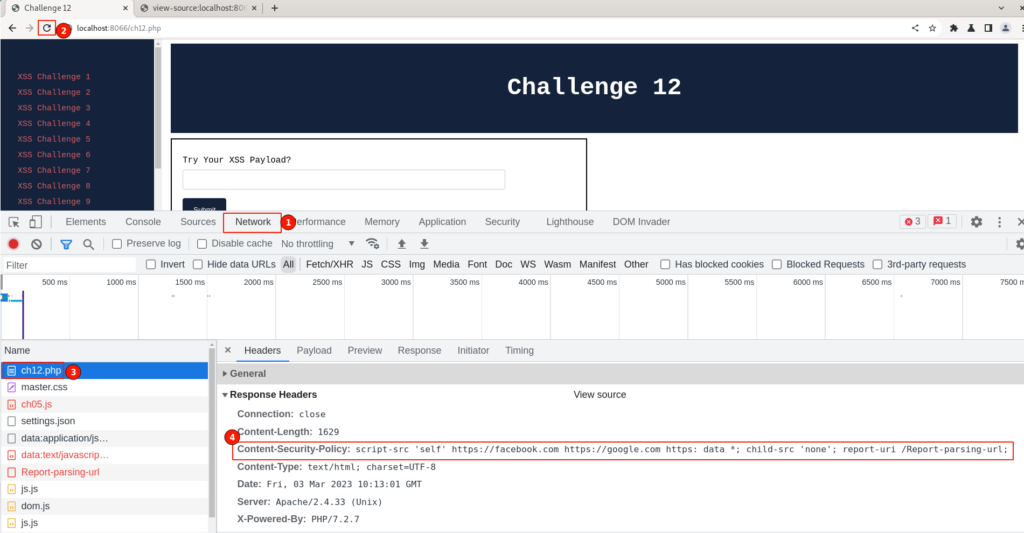 Select the β ch12.phpβ page and scroll to the β Response Headersβ section. Observe, the Content-Security-Policy header which was set by the application server.