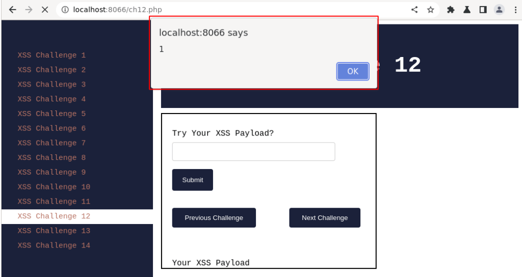 Once your Kurukshetra XSS lab environment is up and running, Visit http://localhost:8066 and navigate to β XSS Challenge 12β.