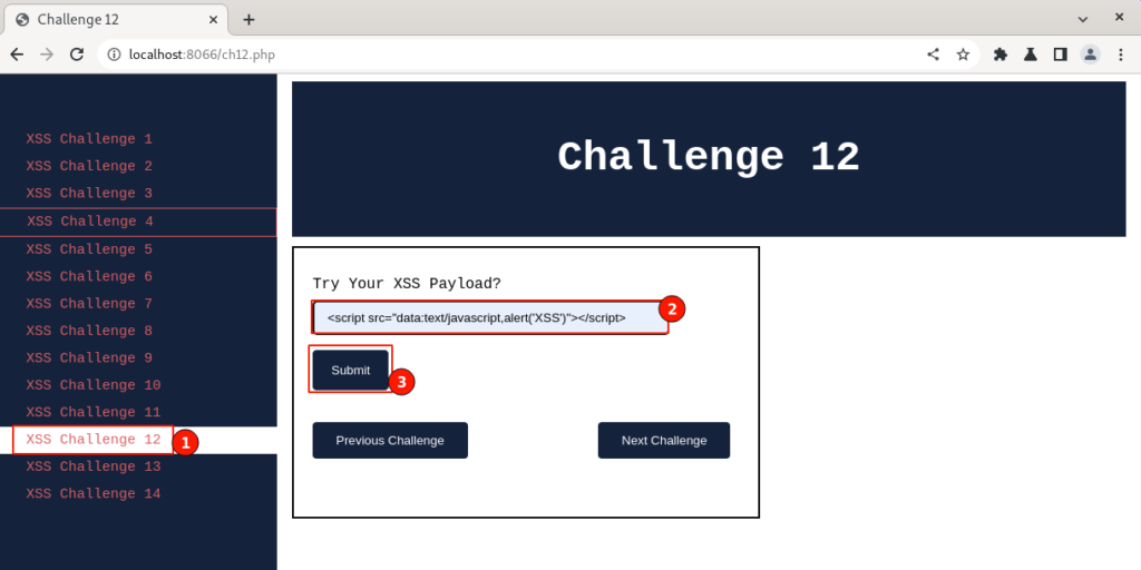 Visit the XSS Challenge 12, paste the above payload in the input form field, and click on the "Submit" button.