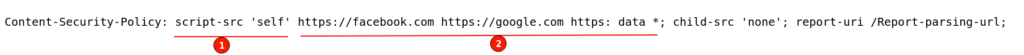Content-Security-Policy: script-src 'self' https://facebook.com https://google.com https: data *; child-src 'none'; report-uri /Report-parsing-url;