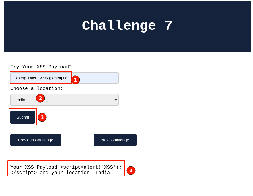 Coming to XSS Challenge 7, an input field is given to key in the text and a drop-down menu option needs to be selected before clicking on the " Submit" button.