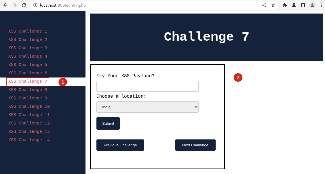 Post setting up the lab visit http://localhost:8066 and ensure it's accessible, then navigate to " XSS Challenge 7".