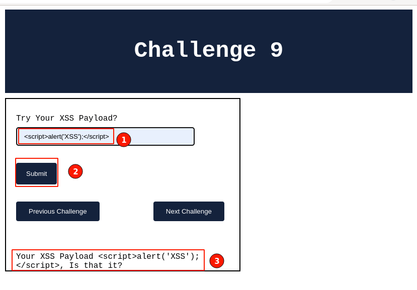 - On the Challenge 9 page, key in the random input value(say " Test XSS") and click on the " submit" button.