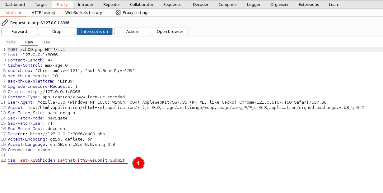 7. Replace the " hidden" param value from " Is that it" with classic XSS payload.