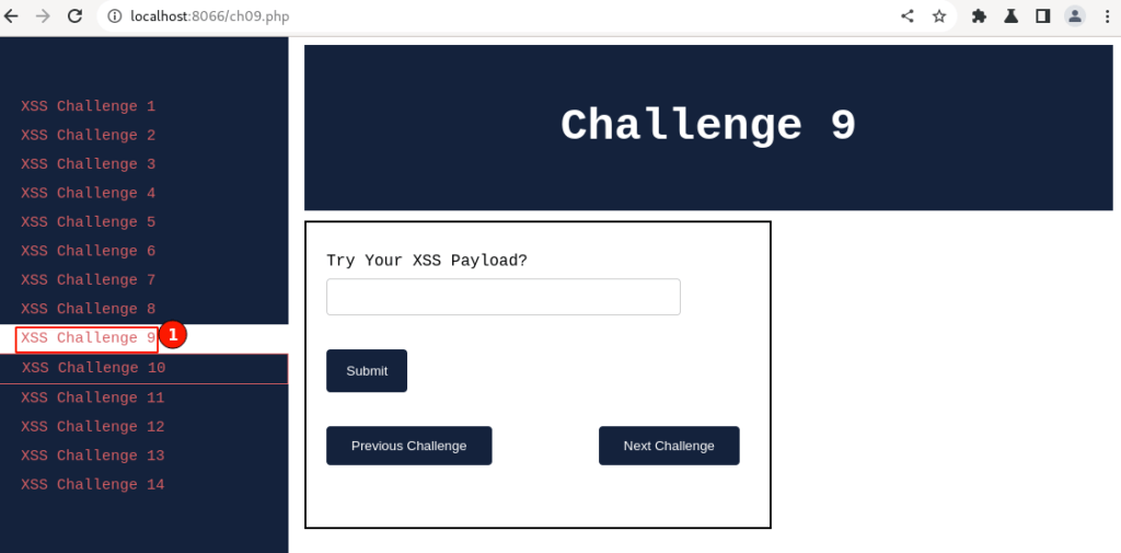 Visit http://localhost:8066 and ensure itβs accessible, then navigate to β XSS Challenge 9β.