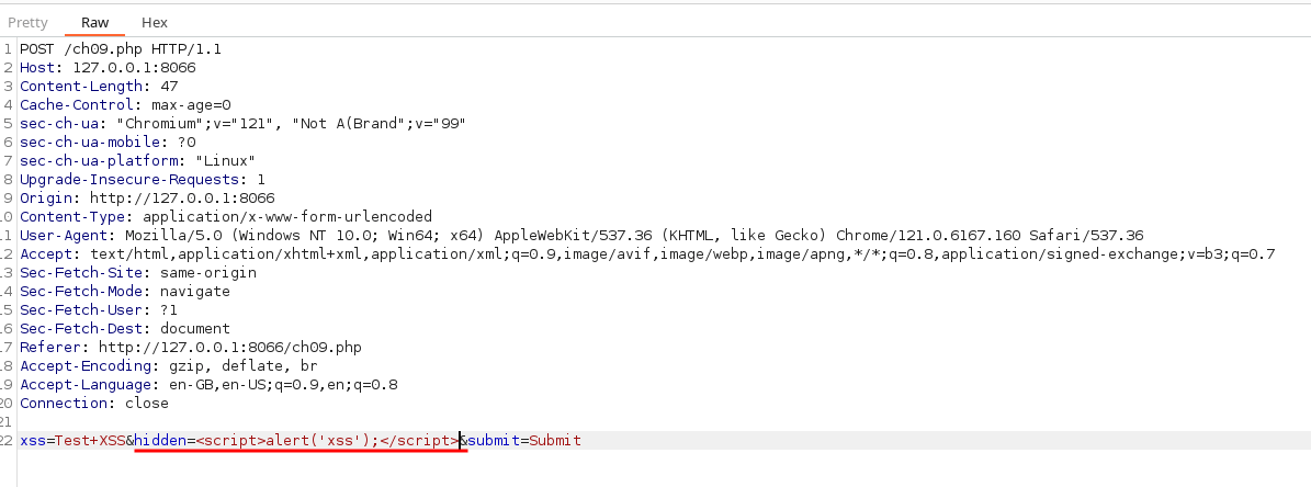 Letβs go ahead and try the XSS payloads in the hidden fields.