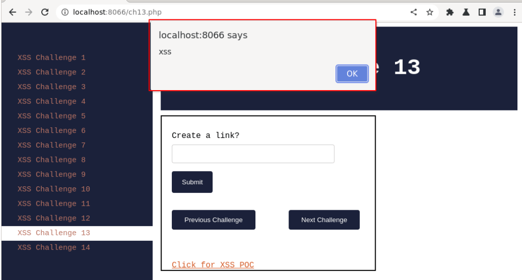 Immediately, a pop-up box is loaded, and a message named โxssโ is displayed. Thus, we have solved XSS challenge 13.