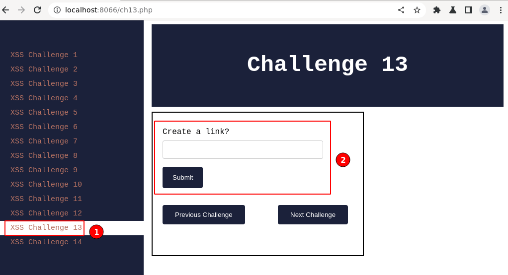 Once your Kurukshetra XSS lab environment is up and running, Visit http://localhost:8066 and navigate to " XSS Challenge 13".