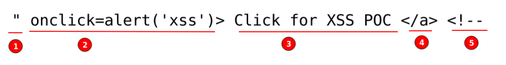 Overall the above XSS payload creates a clickable element that, when clicked, will execute a JavaScript alert dialog with the message โ xssโ.