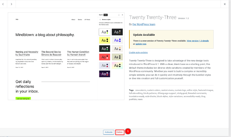 At the bottom of the Theme Details, you can just click on the “Delete” button.
