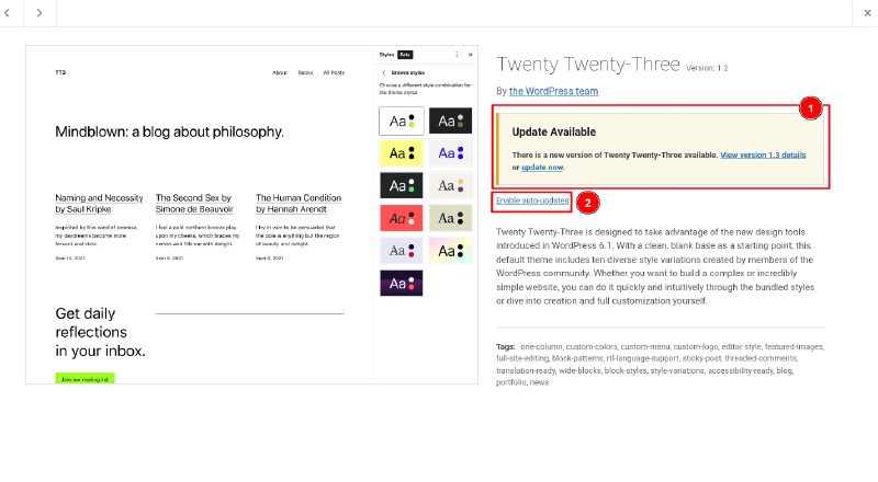 One of the most essential steps is to keep your site updated with the latest version of WordPress core, theme, and plugins being used.