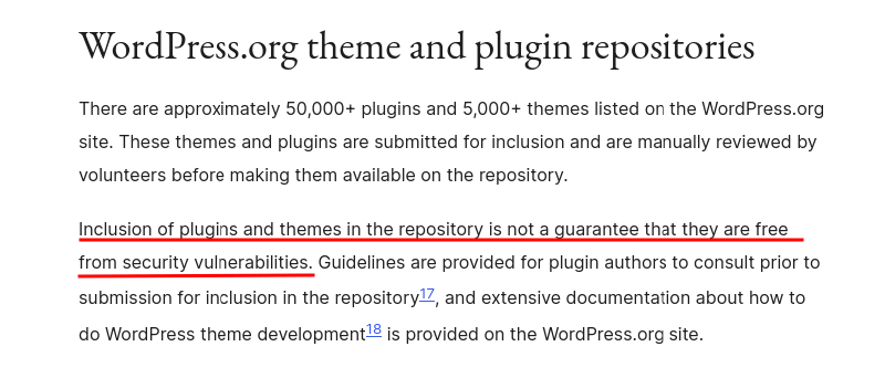 The WordPress Team’s responsibility covers identifying and resolving the security issues in the core software provided. It’s a community project that is used across 10 million websites on the internet. Any programmer can create a third-party plugin or theme based on their needs.