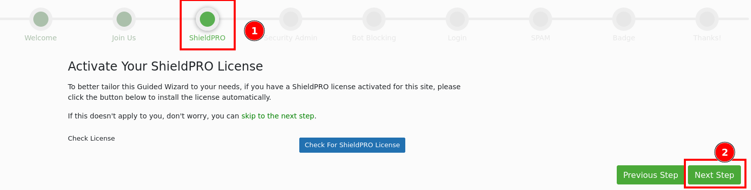 The next step prompts activating the "ShieldPRO" license. As this article only focuses on the free version, I will skip it and click " Next Step."