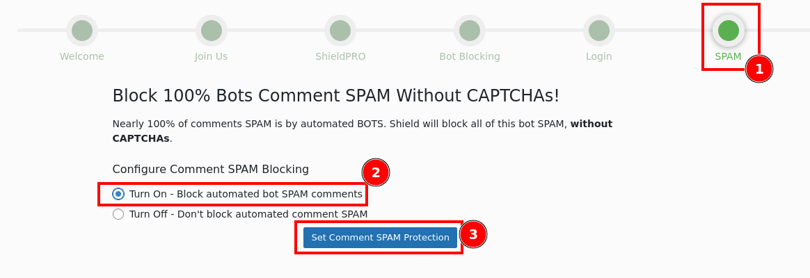 Please check on " Turn On - Block automated SPAM comments" and click on " Set Comment SPAM Protection" to enable.