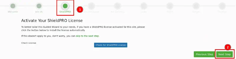 The next step prompts activating the “ShieldPRO” license. As this article only focuses on the free version, I will skip it and click “Next Step.”