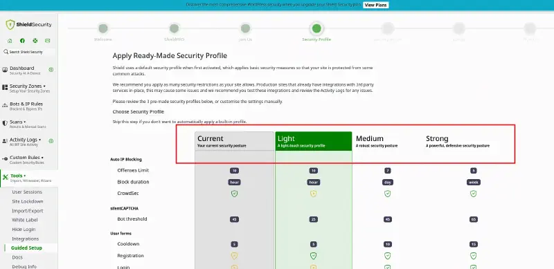 If you’re a first-time user or just want a quick setup, the “Shield Security” plugin provides multiple profiles to choose from.