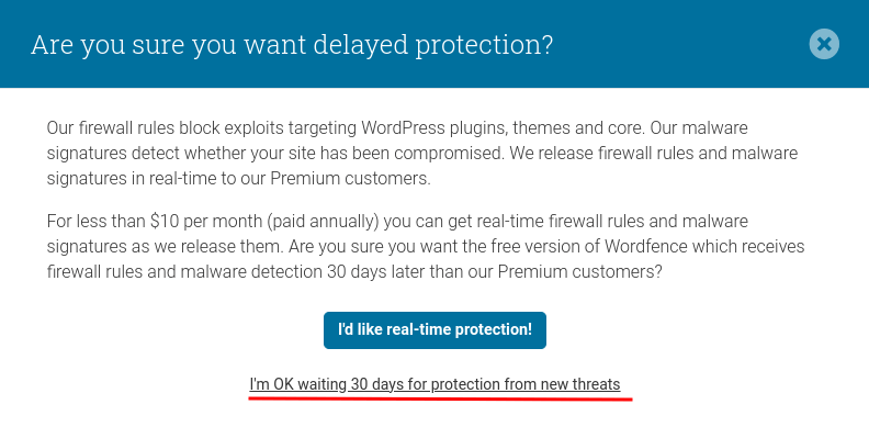 Wordfence requests you to re-confirm and highlights that you will be missing out on the latest exploit protection in real-time.