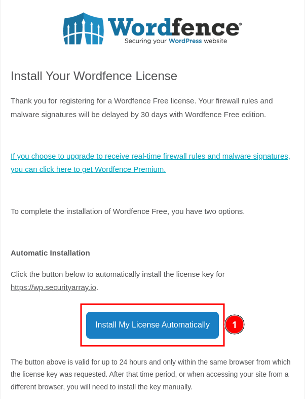 Click on the " Install My License Automatically" button. The license information will be automatically filled in on your WordPress website (if you are logged in).