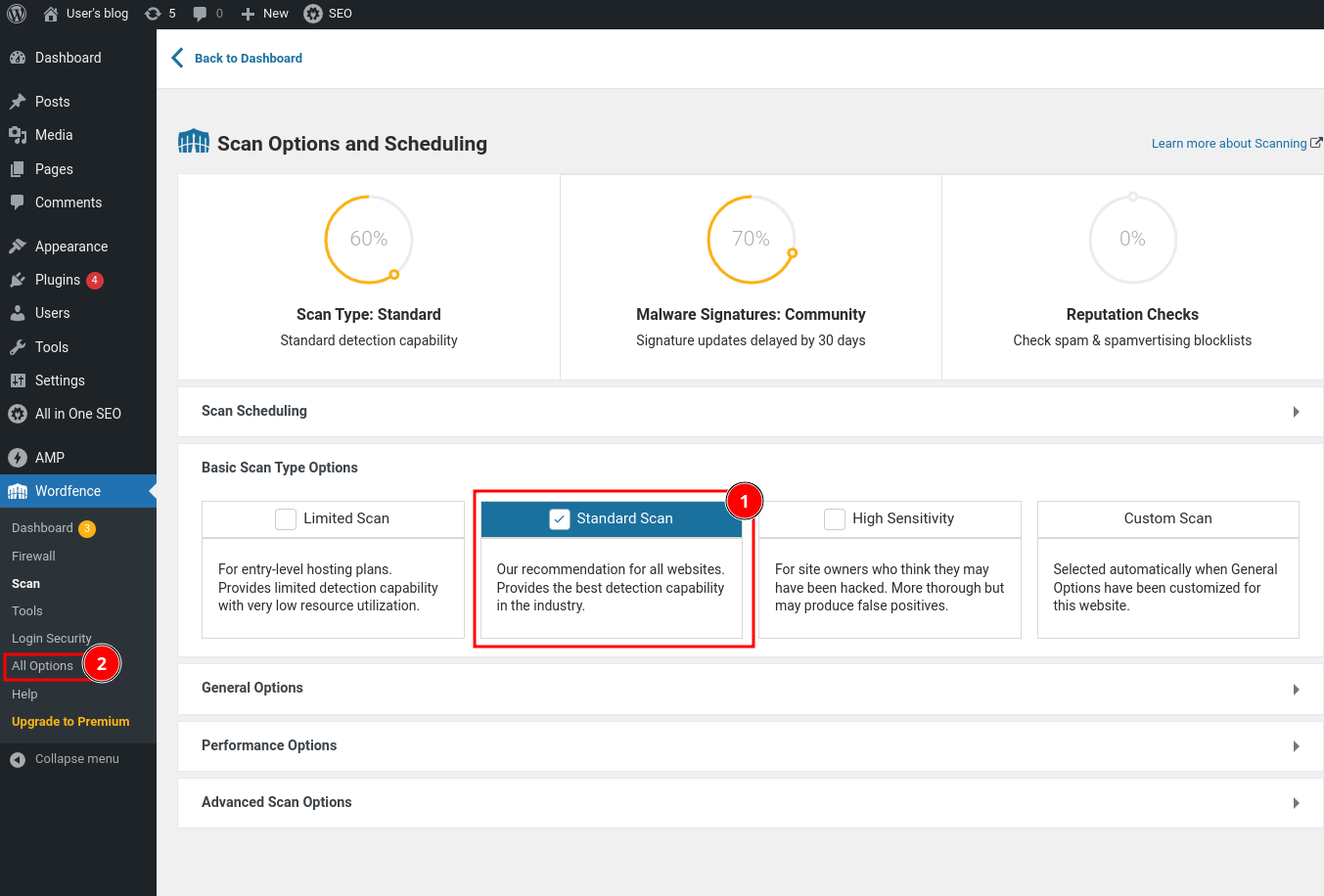 Additional options, like " High Sensitivity," can be used to scan and check if you think your website might be compromised. You can always click on the " All Options" link on the left side menu and check the settings that have been enabled.
