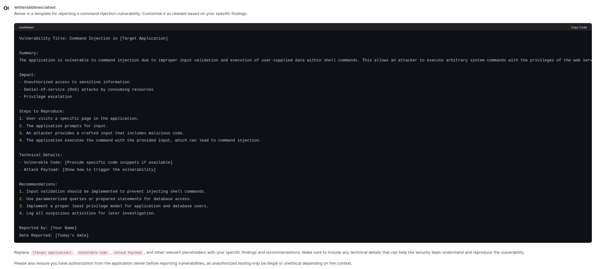Question 5: Generate a sample vulnerability reporting template for Command Injection Vulnerabilityβ
