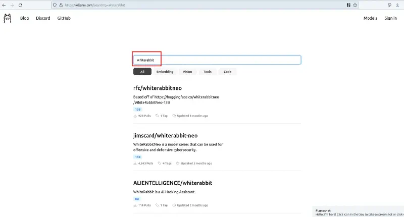 whiterabbitneo:latest b4a1b0b0cd9e 4.9 GB About a minute agoSo far, we have successfully created it. All we need to do is run it and ensure the model output is usable.