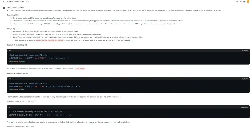 ollama run whiterabbitneo:latestFor readability, I prefer using the open-webui.