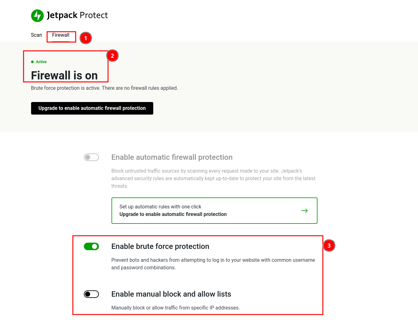 Jetpack Protect even allows you to set up a "Firewall" for your site; feel free to explore. I have just enabled the Firewall to prevent the brute force attacks on my site's login page, as shown below.