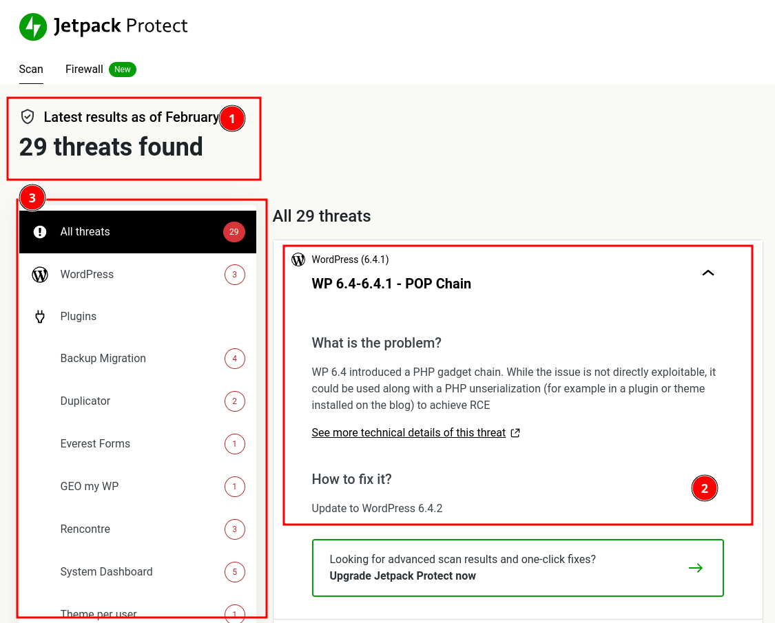 The plugin identified 29 threats on my website, listed above in detail. Additionally, the summary information about each threat is displayed on the right side, which helps you take the next action needed to secure your site.